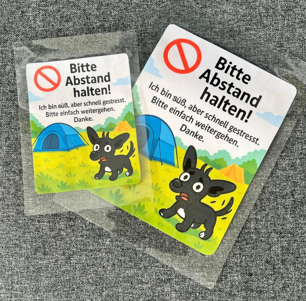 - ggf ein Schild vorbereiten, wenn du nicht möchtest, dass Leute auf der Parzelle deinen Hund einfach streicheln oder füttern (s. unten ein tolles Beispiel unserer Zeltkinder Community )